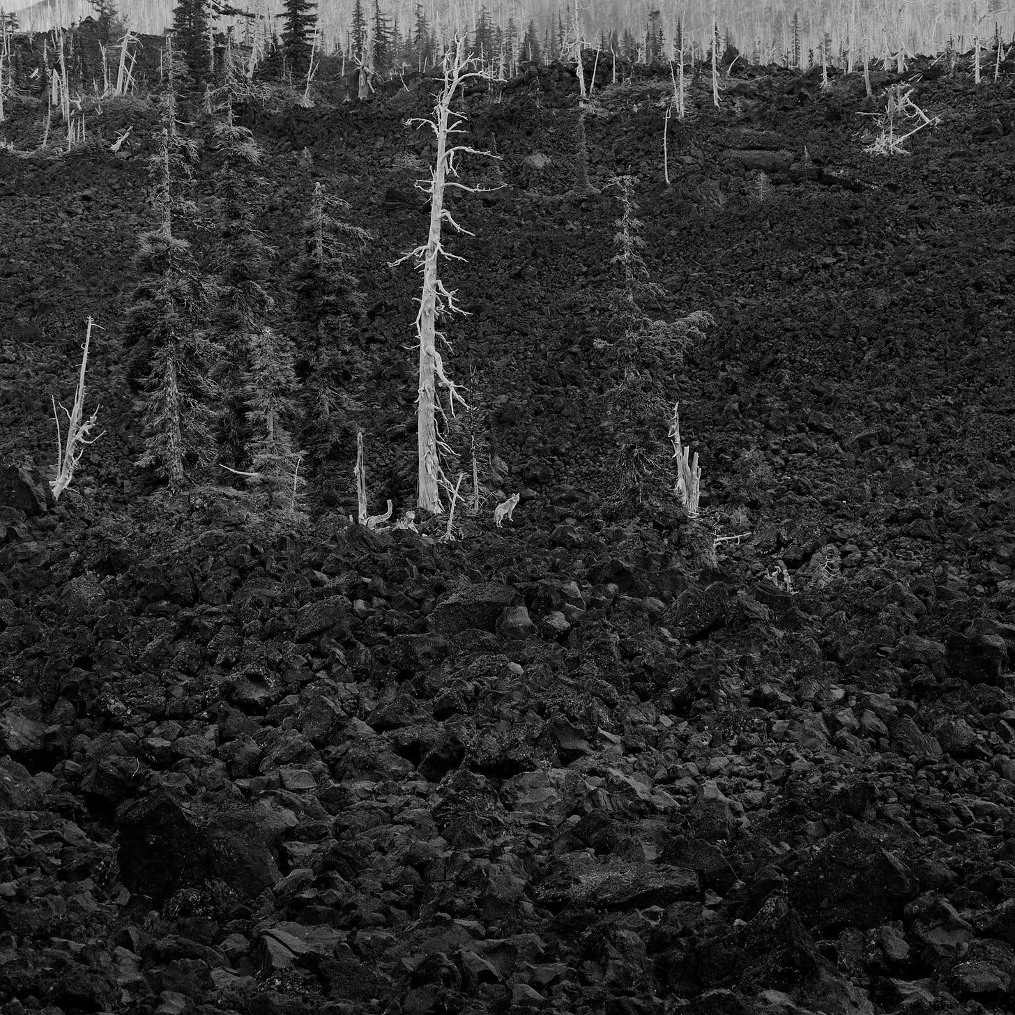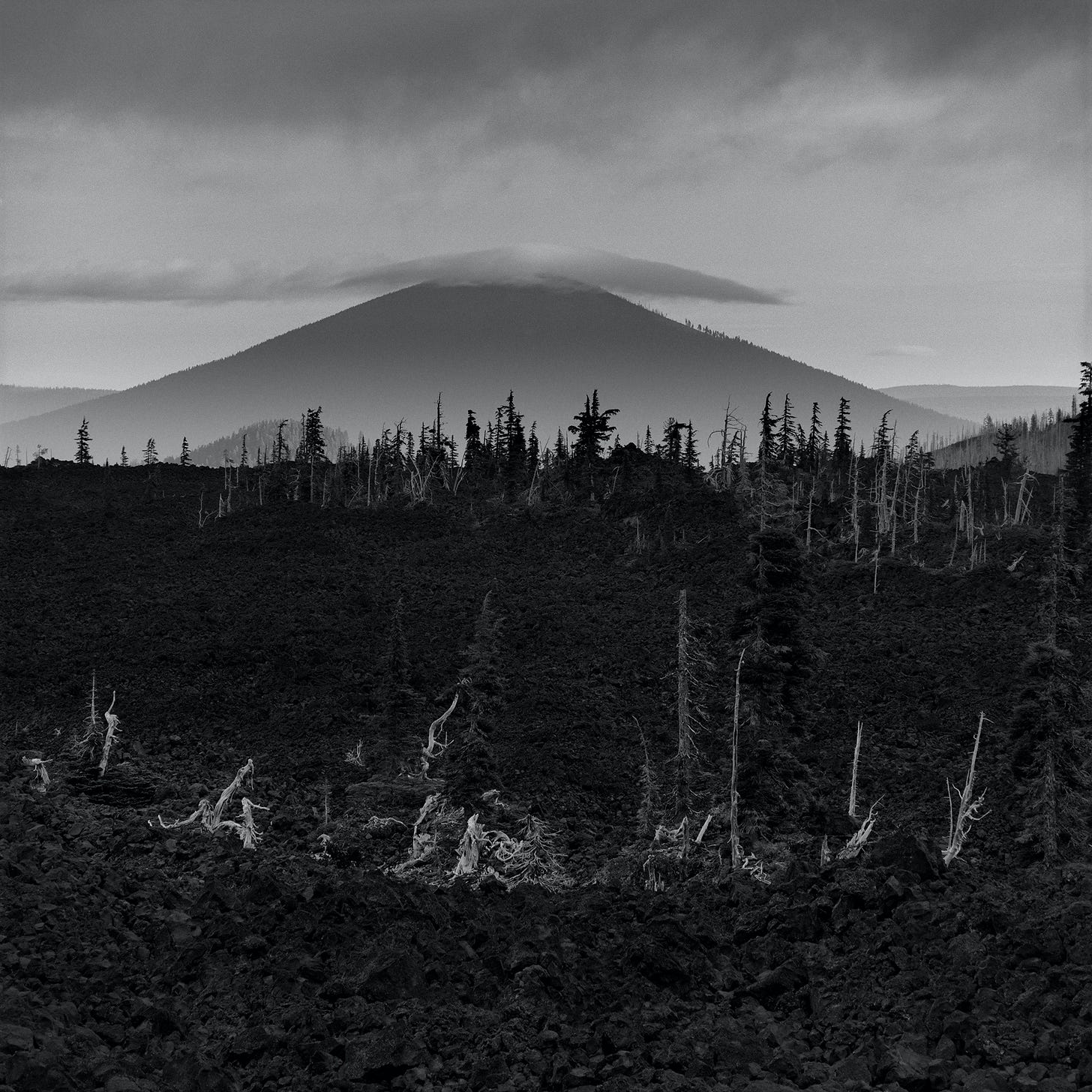 I wake before sunrise and head into the mountains west of Bend Oregon and into a brewing autumn storm. I drive up into a 10 square mile field of lava. The barren black rock folds onto itself extending in sharp relief to the horizon. The road that bisects this place will close for the winter in a few weeks. I park and hike to an overlook perch and setup my Hasselblad, load a roll of black and white film, and look south toward the Sisters Mountains, waiting for sunrise. The mountains are hidden behind a veil of storm clouds streaming from the west. I put my eye to the viewfinder and there, within its bordered confines, my imagination opens. It’s always this way. The framed view becomes my canvas, my whole world. It is the place I am both lost and found. Landscape photography is an art of observation and discovery. The sunrise peaks from below the storm layer, lighting the mountains lower flank. Clouds stream east like flowing water. Rain begins to fall.