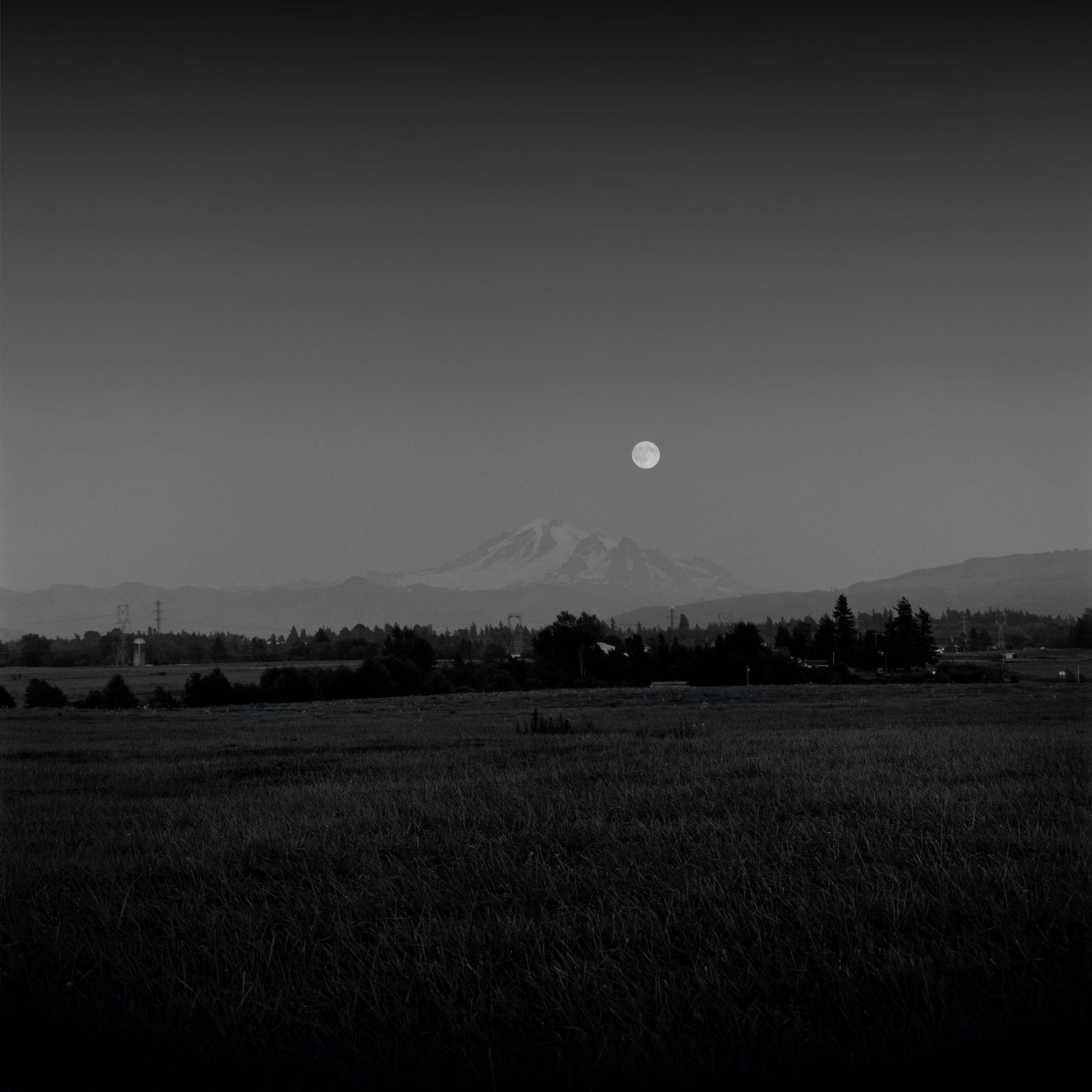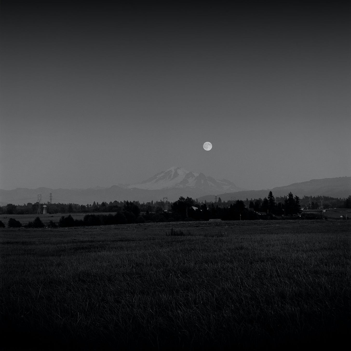 Here is an image I photographed in 2009 in northern Washington State, between Bellingham and the Canadian border. My mom and I had been crisscrossing the open farmland for sunset. We weren’t getting much and were heading back to Bellingham when she saw the full moon rising from behind the flanks of Mount Baker. Excitement shot through and we raced the backroads looking for a foreground. I setup the image and remembered that to get detail (so the moon won’t blowout and just be a bright circle) in a full moon, you can use the sunny 16 rule (1/ISO F/16). I set the exposure and hoped I’d get some detail in the shadowed foreground.